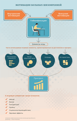 Мы стремимся к геймификации (т.е. к использованию игровых элементов) в компьютеризированной когнитивной тренировке больных шизофренией. Однако, возможно, что игровые элементы также могут оказывать неблагоприятное воздействие на результаты когнитивной тренировки (например, отвлекать пациента), что может перевесить их потенциальные преимущества., как мотивационной техники. Награды и обратная связь продолжают доминировать в сфере геймификации, тогда как социальные функции (например, конкуренция) используются недостаточно. Игровые обучающие задачи в большей степени мотивируют больных шизофренией, делая их более мотивирующими/увлекательными и более требовательными/сложными, чем неигровые или менее геймифицированные задачи, при этом никакого влияния на область обучения здесь не выявляется.
