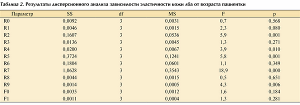 1. Для оценки влияния возраста на параметр эластичности кожи лба провели однофакторный дисперсионный анализ (табл. 2).