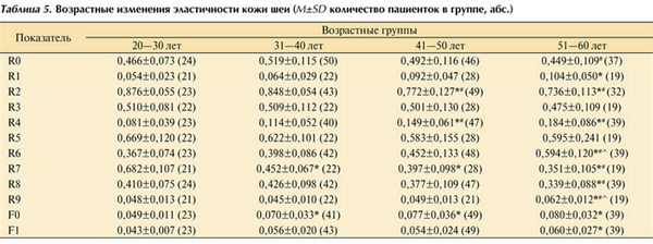 Таблица 5. Возрастные изменения эластичности кожи шеи (M±SD количество пациенток в группе, абс.)