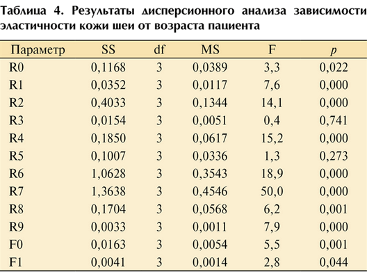2. Для оценки влияния возраста на параметр эластичности кожи шеи также проведен однофакторный дисперсионный анализ (табл. 4). Возрастной фактор оказывает влияние на большинство параметров указанной зоны (F>1; р≤0,05).
