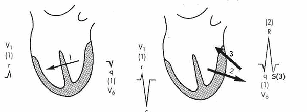 Следующий за зубцом Р зубец Q в норме отражает деполяризацию межжелудочковой перегородки. Процесс возбуждения начинается с деполяризации левой части межжелудочковой перегородки. Фронт возбуждения движется слева направо и вперед (вектор 1) (рисунок 3). Величина вектора ЭДС невелика, так как масса миокарда межжелудочковой перегородки небольшая.