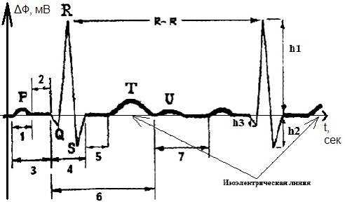 Строгая последовательность электрического сердечного цикла представлена на ЭКГ рядом зубцов, обозначаемых латинскими буквами: P, Q, R, S, T, U (рисунок 2).