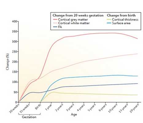 Описательные исследования показали нам, что головной мозг с момента рождения до года претерпевает множество изменений: быстрый рост серого вещества, миелинизация, развитие мозговых структур, гирификация. После двух лет процесс развития замедляется.