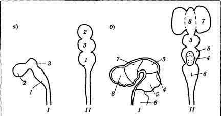 | Рис. 2.2. Стадии раннего развития головного мозга: а — стадия трех мозговых пузырей; б — стадия пяти мозговых пузырей; I — вид сбоку; II — вид сверху; 1 — задний мозг; 2 — передний мозг; 3 — средний мозг; 4 — мозжечок; 5 — мост; 6 — продолговатый мозг; 7 — промежуточный мозг; 8 — конечный мозг |