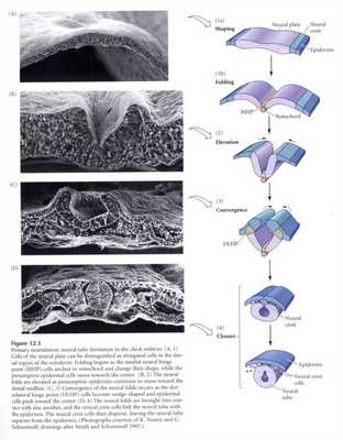 Одновременно происходит погружение нервной трубки вовнутрь зародыша и формирование и нервных гребней по бокам вдоль нее. На головном конце нервной трубки образуются три первичных мозговых пузыря, из которых впоследствии формируется головной мозг, на каудальном же конце нервная трубка соединяется со спинным мозгом. Нервный гребень в последствии дает начало образованию периферической нервной системе. Ткани, образующие нервную бороздку, и, в последствии, нервную трубку, состоят из нейробластов и спонгиобластов, из первых образуются нейроны, из вторых — клетки глии.