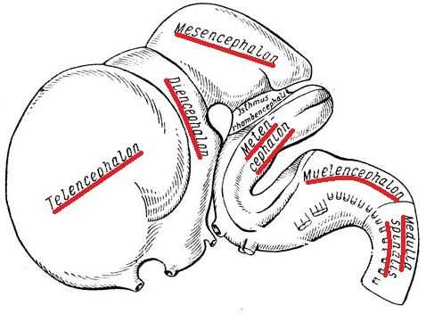 В передней (ростральной) части мозговой трубки образуются два первичных мозговых пузыря - архэнцефалон и дейтерэнцефалон. В начале четвертой недели у зародыша дейтерэнцефалон делится на средний (mesencephalon) и ромбовидный (rhombencephalon) пузыри, а архэнцефалон превращается на этой (трехпузырной) стадии в передний мозговой пузырь (prosencephalon). В нижней части переднего мозга отрастают обонятельные лопасти, дающие начало обонятельному эпителию, луковицам и трактам. Из дорзолатеральных стенок образуется сетчатка, зрительные нервы и тракты.