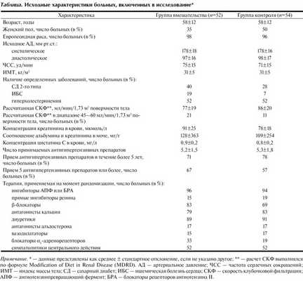С 9 июня 2009 г. по 15 января 2010 г. из 190 обследованных больных 106 были включены в исследование. Исходно группы существенно не различались по возрасту, полу, уровню САД и диастолического артериального давления (ДАД), расовой принадлежности, большинству сопутствующих заболеваний, а также сообщенной продолжительности приема антигипертензивных препаратов (см. таблицу). В группе вмешательства исходно функция почек была статистически значимо хуже, чем в группе контроля (рассчитанная СКФ достигала 77 и 86 мл/мин/1,73 м 2 поверхности тела соотв.; p=0,013). Однако исходная концентрация цистатина С в крови статистически значимо не различалась между группами. В основном больные обеих групп принимали сходное число лекарственных препаратов, относившихся к определенным классам. Диуретики, включая альдостерон, применяли более 89% больных. Из 106 больных, включенных в исследование, в анализ основного показателя в группе вмешательства и группе контроля были включены данные о 49 и 51 больном соотв. В каждой группе по 3 больных не наблюдались до конца исследования в связи с отказом от продолжения участия в исследовании или неявкой в исследовательский центр для обследования.