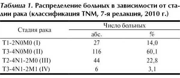 Рак I стадии (классификация TNM, 7-я редакция, 2010 г.) диагностирован у 27 (14,0%) больных (табл. 1). В 116 (60,1%) наблюдениях опухоль инфильтрировала все слои кишечной стенки, но поражения лимфатических узлов отмечено не было. Метастазы в регионарные лимфатические узлы выявлены в 44 (22,8%) наблюдениях. Еще 6 (3,1%) больным с диагностированными множественными отдаленными метастазами выполнены паллиативные вмешательства.