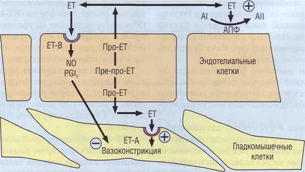 ЕТ-1 - наиболее сильный вазоконстриктор из всех известных факторов, доминирует в эндотелиальных клетках сосудов человека. Он также присутствует в небольших количествах в гладких мышечных клетках (ГМК) и кардиомиоцитах. ЕТ не хранится в клетках, а постоянно синтезируется de novo. Синтез ЕТ и освобождение его из эн-