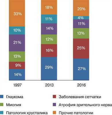 Распространенность и нозологическая структура причин инвалидности по зрению в России сопоставимы с этими показателями в развитых странах. Показатель инвалидности по причине заболеваний глаз составил 5,1 на 10 тыс. населения, основные причины инвалидности — глаукома (27%), заболевания сетчатки (25%), в том числе ВМД (12,5%) и ДР (8%) [15]. На рисунке представлена структура причин инвалидности по зрению за 1997—2016 гг.