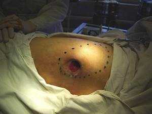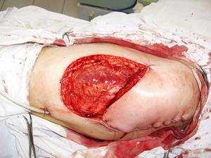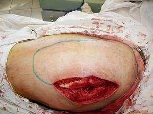 Рис. 5. Подфасциально расположенная полость значительно превышает размеры кожного дефекта.