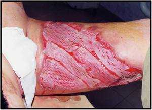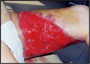 Рис. 2. Вид раны на 3-и сутки после аутодермопластики расщепленным лоскутом.