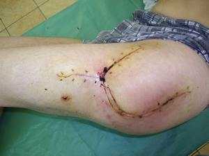 - Раневой дефект подвергается хирургической обработке. Удаляются все оставшиеся некротизированные ткани - сухожилия, измененная надкостница. После этой хирургической обработки рана должна принять вид кровоточащей поверхности без внешних признаков инфекционного процесса.