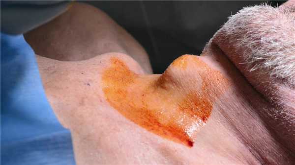 Подготовьте переднюю часть шеи с помощью очищающего средства, такого как хлоргексидин или повидон-йод, и оберните шею стерильной салфеткой.