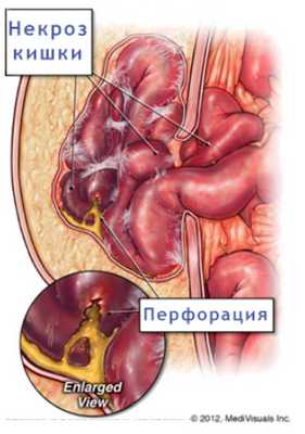 Рис 2. Ущемление грыжи с развитием некроза и перфорации кишки