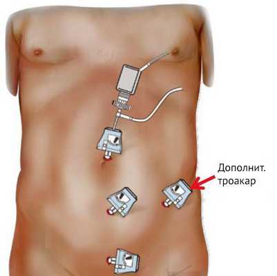 - Следующий этап - введение через проколы специальных трубок - лапаропортов, через которые в свою очередь вводятся манипуляторы.