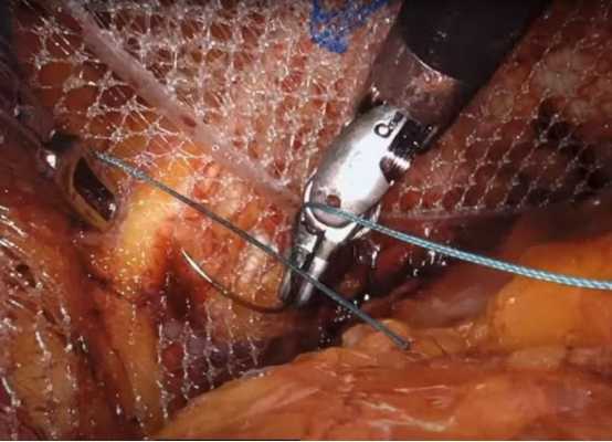 8. Первым шагом крепления сетки является сшивание сетки с обеими связками Купера. Низкая фиксация необходима для защиты надлобковой области, потому что векторы внутрибрюшного давления направлены вниз. Краниально двумя швами фиксируют сетку вокруг мечевидного отростка, покрывая эпигастральную область. Сетка может быть зафиксирована в ретромускулярном пространстве с помощью биологического клея с лучшими результатами в плане послеоперационной боли и восстановления. Пространство и сетка орошаются солевым раствором с гентамицином.