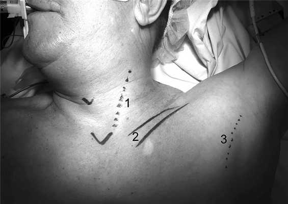 1 — медиальный край левой грудиноключично-сосцевидной мышцы; 2 — левая ключица; 3 — линия разреза вдоль края левой большой грудной мышцы.