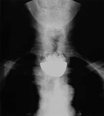 Рис. 1. Рентгенограмма пищевода. Глоточно-пищеводный дивертикул.