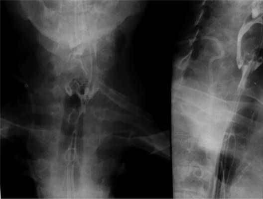 Продолжительность операции 137 мин. В послеоперационном периоде осложнений, в том числе клинических признаков повреждения возвратного гортанного нерва, не отмечено. Контрольное рентгеноконтрастное исследование выполнено на 2-е сутки — признаков несостоятельности швов не установлено. Больному разрешили пить, а с 3-х суток употреблять жидкую пищу. Выписан из стационара на 7-й день.