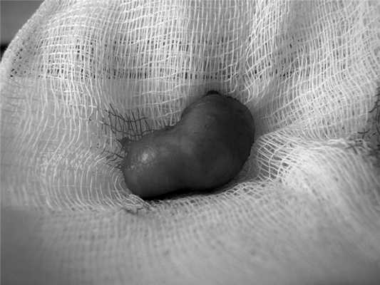 Макроскопически удаленная опухоль округло-овальной формы, желтоватого цвета, полупрозрачная, заполнена желеобразным содержимым (рис. 4). Рисунок 4. Макропрепарат удаленного ганглия.