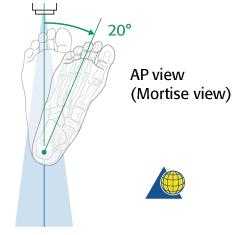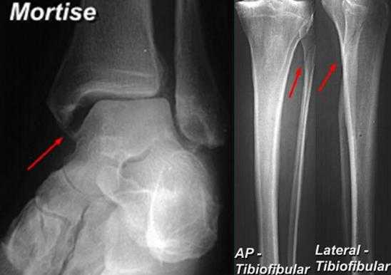 Вторым важным моментом является выполнение снимков с выведением межберцового «паза» (проекция Mortise, 15-20° внутренней ротации голени).