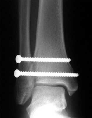 В случаях когда фиксация синдесмоза выполняется по поводу переломов лодыжек типа С по Веберу существует высокая вероятность (10%) формирования межберцового синостоза.