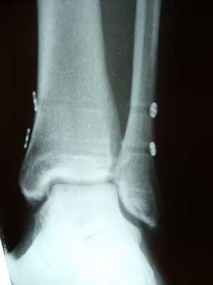 На рентгенограммах видно что после удаления позиционного винта взаимоотношения большеберцовой и малоберцовой костей остаётся прежним, что свидетельствует в пользу того что лечение прошло успешно.