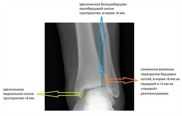 -сниженное взаимное перекрытие берцовых костей, в норме >6 мм на передней и >1 мм на «пазовой» рентгенограммах.
