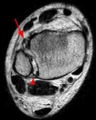 При хронической латеральной нестабильности голеностопного сустава передняя таранно-малоберцовая связка ослабленная, неэффективная для стабилизации голеностопного сустава. В анамнезе у пациентов обычно имеет место периодически растяжение связок в течение 2-х лет, имеется нестабильность таранной кости на рентгеновских снимках.