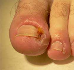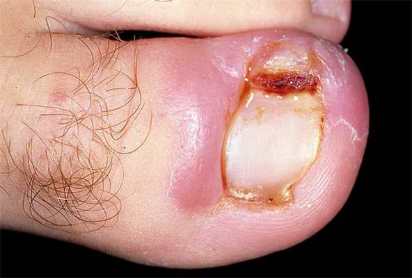 - Абсцесс пальца стопы — формирование полости с гнойным содержимым, отёк и покраснение всей ногтевой фаланги. Требует хирургического вмешательства.