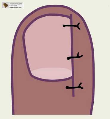 Суть оперативного метода заключается в следующем: под местной анестезией по Оберсту-Лукашевичу р-ром лидокаина 2% или ультракаина (современный стоматологический анестетик) выполняется краевая продольная резекция 10-15% ногтевой пластины со стороны ее врастания в околоногтевой валик. Сам околоногтевой валик продольно иссекается на ширину в 3-5 мм, разрез при этом клиновидно продолжается на задний околоногтевой валик для доступа к матриксу (зоне роста ногтя).