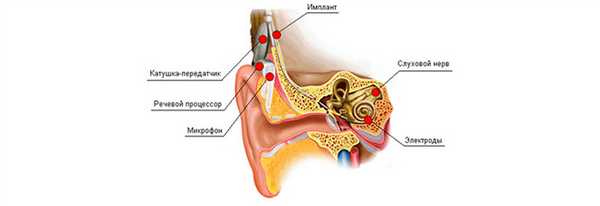 Кохлеарный имплантат вживляется в зону за ухом. Электродами он соединяется с улиткой. Принцип работы слуховых аппаратов и имплантов полностью отличается. СА усиливают звуки, а КИ заменяет повреждённые рецепторы улитки. Имплант обеспечивает доставку звуковой информации непосредственно к слуховому нерву при помощи электрической стимуляции.