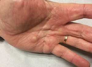 по ладонной поверхности кисти в области пальца или ладони появляются узелки, причиняющие дискомфорт при надавливании; движения в пальце не ограничены; пациенты обращают внимание на косметические неудобства.