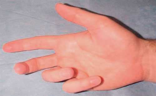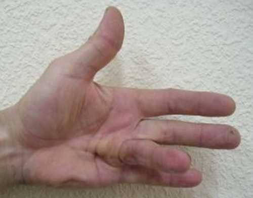 тяж резко деформирует ладонь, палец становится грубым, спаянным с кожей. Угол сгибания в суставах пальца более 90 градусов.
