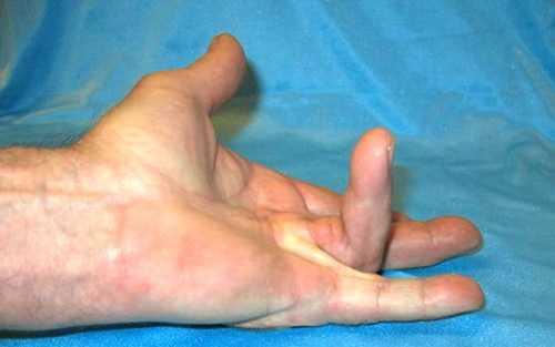 сформирован тяж на ладони и на пальце (чаще страдают мизинец и безымянный палец), который сгибает палец в суставах и притягивает его к центру ладони (палец согнут не более 90 градусов).