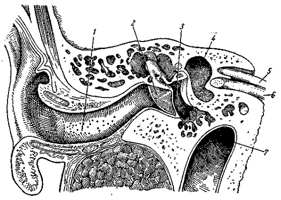 1 - наружный слуховой проход; 2 - барабанная перепонка; 3 - полость среднего уха; 4 - преддверие; 5 - n. vestibuli; в - n. cochleae; 1 - bulbus v. jugularis.