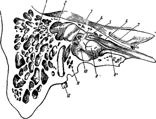 1 - cellulae mastoideum; 2 - antrum mastoideum; 3 - processus pyramidalis и сухожилие m. stapedii; 4 - стремя; 5 - сухожилие m. tensoris tympani; 6 - m. tensor tympani; 7 - n. petrosus superficialis major; 8 - pars ossea tubae auditivae; 9 - promontorium и sulcus tympanicus; 10 - fenestra cochleae и m. stapedius; 11 - n. facialis.