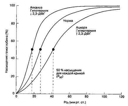 На процесс присоединения кислорода к гемоглобину влияют следующие факторы: концентрация ионов водорода, напряжение углекислого газа, температура, концентрация 2,3-дифосфоглице-рата (2,3-ДФГ). Их суммарный эффект на взаимодействие гемоглобина с кислородом отражает величина P50 — значение напряжения кислорода, при котором гемоглобин насыщен на 50% (рис. 22-23). Изменение каждого из факторов способно смещать кривую диссоциации вправо (увеличение P50) или влево (уменьшение Р.™). Сдвиг вправо вызывает снижение сродства гемоглобина к кислороду, вытесняет кислород из связи с гемоглобином и увеличивает количество кислорода, доступного тканям; сдвиг влево дает обратный эффект. В норме P50 составляет 26,6 мм рт. ст. (3,4 кПа).