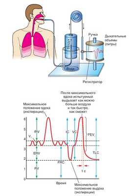 Определение объема форсированного выдоха (проба Тиффно) за первую секунду (ОФВ1) - во время спирометрического исследования пациент должен сделать максимальный вдох, задержать дыхание на вдохе, а потом как можно быстрее выдохнуть. За первую секунду форсированного выдоха в норме он должен выдохнуть 70% от форсированной жизненной емкости легких. При увеличении сопротивления дыхательных путей этот показатель уменьшается.