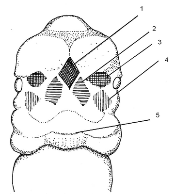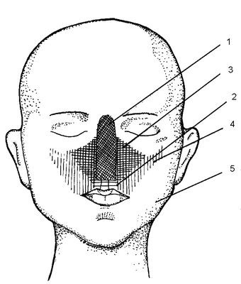 Рис. 4. Схема развития лица: А — эмбрион на 6-й неделе развития; Б — лицо человека; 1 — треугольное поле; 2 — медиальный носовой отросток; 3 — латеральный носовой отросток; 5 — нижнечелюстной отросток