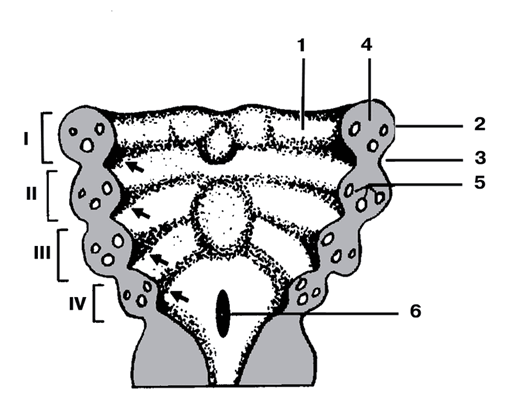 Рис. 3. Разрез глотки эмбриона человека на 5-й неделе развития: I—IV — жаберные дуги, стрелки — жаберные карманы; 1 — эпителий первичной глотки; 2—эктодерма; 3 — жаберные щели; 4 — мезенхима; 5 — нерв, артерия, хрящ; 6 — отверстие гортани.