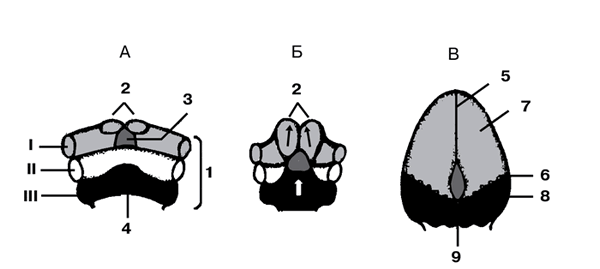 Рис. 7. Развитие языка: А — 4-я неделя внутриутробного развития; Б — 5-я неделя внутриутробного развития; В — сформированный язык; I—III (1) — жаберные дуги; 2 — боковые язычные бугорки; 3 — непарный бугорок; 4 — скоба; 5 — срединная бороздка; 6 — терминальная бороздка; 7 — тело языка; 8 — корень языка; 9 — слепое отверстие. Стрелки — направление роста закладок