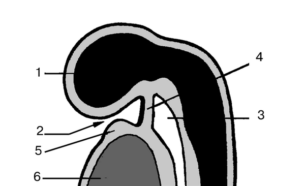 Рис. 1. Сагиттальный разрез головы эмбриона человека на 4-й неделе развития: 1 — передний мозг; 2 — ротовая ямка (бухта); 3 — передняя кишка; 4 — глоточная (ротовая) перепонка; 5 — мандибулярный отросток; 6 — закладка сердца.