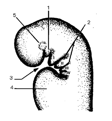 Рис. 2. Внешний вид головной части 5-недельного эмбриона человека: 1 - верхнечелюстной отросток; 2 - жаберные щели; 3 - ротовая ямка; 4 - закладка сердца; 5 - хрусталиковая плакода.