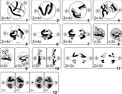 9 — профаза 2; 10 — метафаза 2; 11 — анафаза 2; 12 — телофаза 2.
