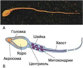 Сперматозоиды - мелкие подвижные клетки, у человека их длина всего около 60 мкм. У разных организмов они отличаются формой и размерами, но, как правило, все сперматозоиды имеют головку, шейку и хвост, обеспечивающий их подвижность. В головке сперматозоида находится ядро, содержащее хромосомы, и акросома - особый пузырёк с ферментами, необходимыми для растворения оболочки яйцеклетки. В шейке сосредоточены митохондрии, которые обеспечивают движущийся сперматозоид энергией (рис. 63).