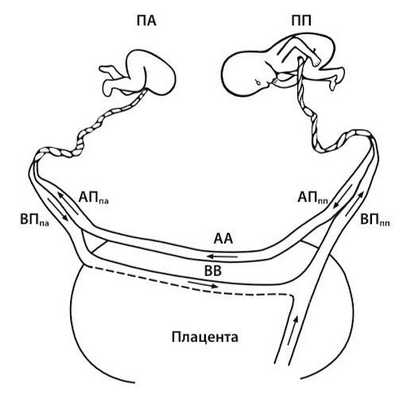 ПА — плод-акардиус, ПП — плод-помпа, АППА — артерия пуповины плода-акардиуса, АППП — артерия пуповины плода помпы, ВППА — вена пуповины плода-акардиуса, ВППП — вена пуповины плода-помпы.