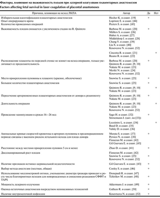 В таблице Факторы, влияющие на выживаемость плодов при лазерной коагуляции плацентарных анастомозов авторами статьи суммарно приведены факторы, влияющие на выживаемость плодов при лазерной коагуляции плацентарных анастомозов.