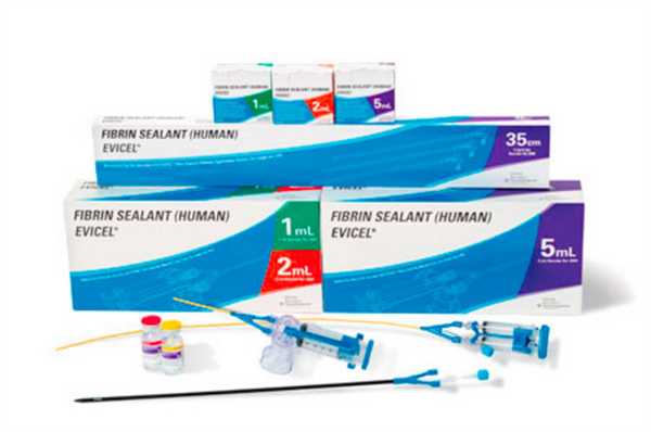 Фибриновый клей Evicel (Ивисел) применяется как дополнительный способ гемостаза (в случае недостаточности стандартных средств) и герметизации сосудистого шва. Смешивание действующих компонентов — фибриногена и тромбина — происходит с помощью специального аппликаторного устройства непосредственно перед раной. Образующийся сгусток мгновенно закупоривает открытый кровяной сосуд и образует прозрачную эластичную пленку. Применяется в нейро-, кардио-, сосудистой хирургии, гинекологии, урологии, общей хирургии. Evicel изготавливается только на основе человеческих компонентов.
